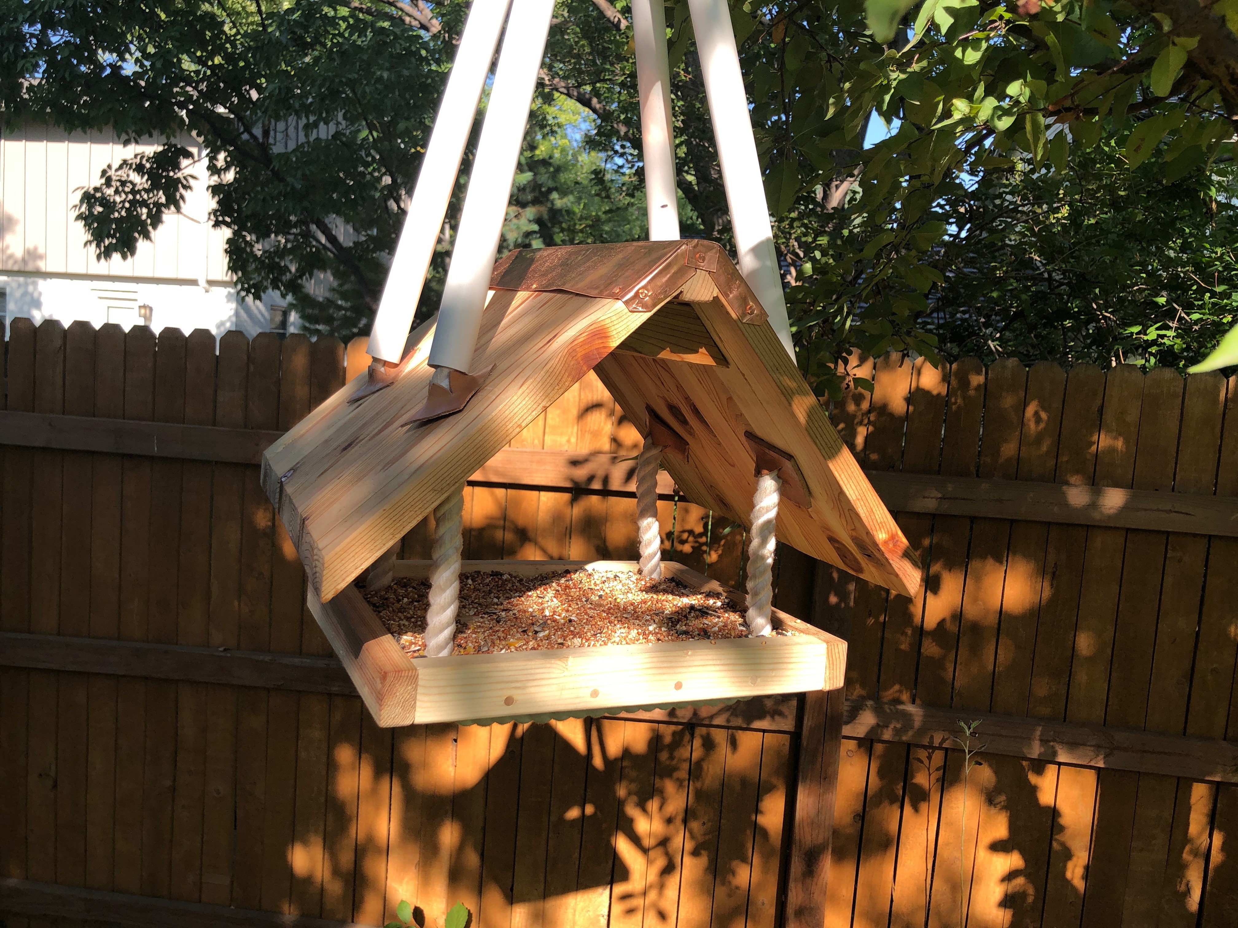 They had better luck with my mom. So I found some cedar furring strips, stuck them together with dowels and glue, and hung the dang thing with an old horse bridle rope. To make it look uglier I then added lengths of PVC pipe as a squirrel deterrent. Hopefully the nasty little rodents will figure it out.
